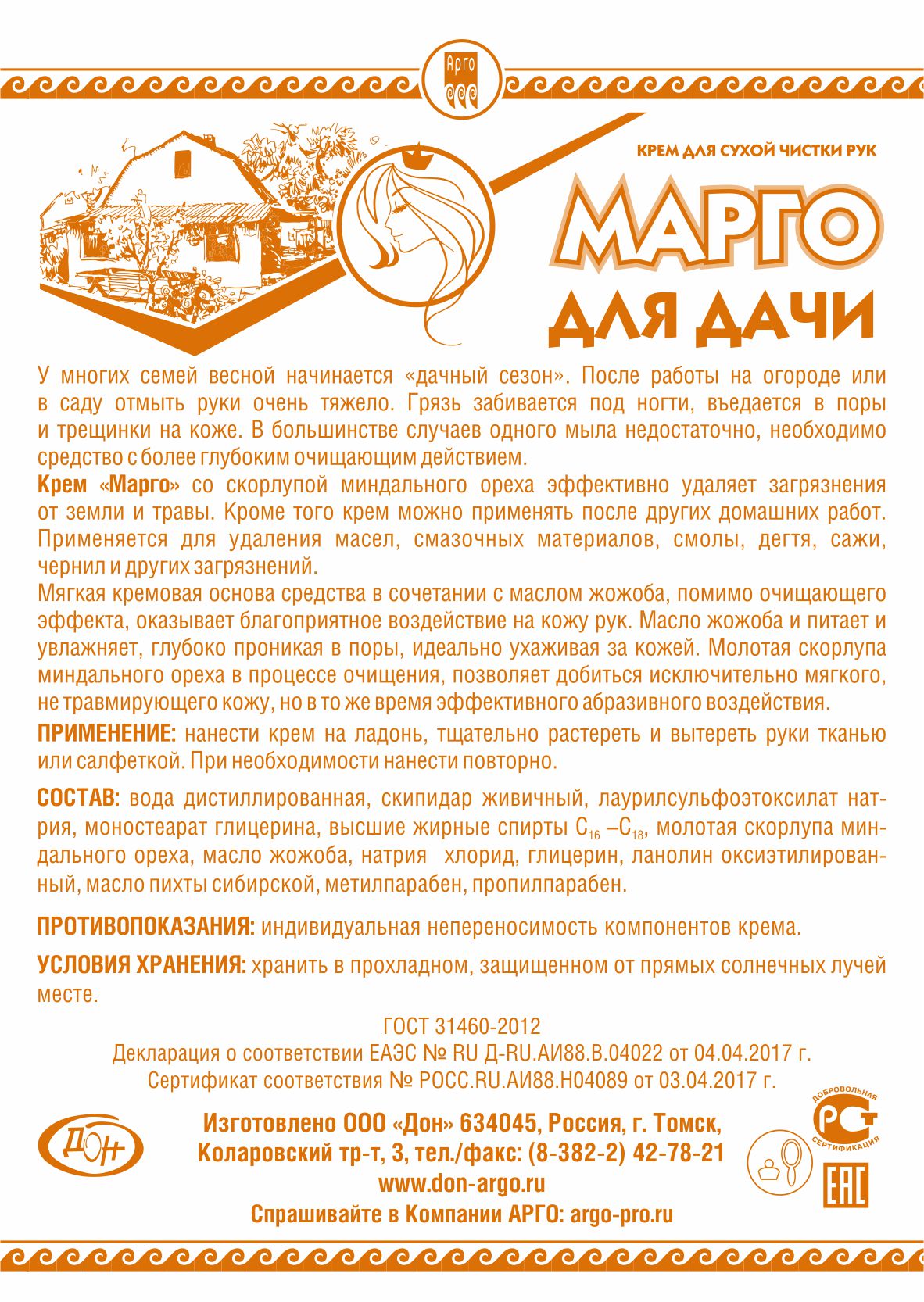 Крем «Марго» со скорлупой миндального ореха эффективно удаляет загрязнения от земли и травы. Кроме того крем можно применять после других домашних работ. Применяется для удаления масел, смазочных материалов, смолы, дёгтя, сажи, чернил и других загрязнений.