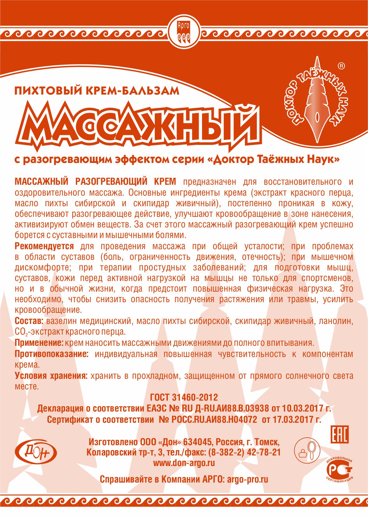 Массажный разогревающий крем предназначен для восстановительного и оздоровительного массажа. Основные ингредиенты крема (экстракт красного перца, масло пихты сибирской и скипидар живичный), постепенно проникая в кожу, обеспечивают разогревающее действие, улучшают кровообращение в зоне нанесения, активизируют обмен веществ. За счет этого массажный разогревающий крем успешно борется с суставными и мышечными болями.