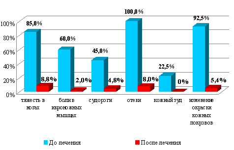 По данным объективного осмотра (антрополитрическое исследование) регресс отеков составил 79 ╠ 1,9%