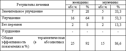 Это позволяет расценить этот комплекс лечения как патогенетический. К числу положительных моментов относится отсутствие ятрогенного повреждающего действия на внутренние органы, в частности желудочно-кишечного тракта, нередко развивающегося при фармакотерапии. Рекомендуем использование этого лечебного комплекса в широкую практику лечебных учреждений, санаториев - профилакториев, а с условием приобретения портативного аппарата АДМ "Донна" и в домашних условиях. Данный комплекс лечения целесообразно проводить 2-4 раза в год.